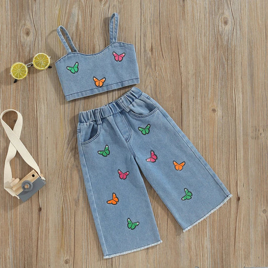 FlutterDenim™ – Denim Set met Vlinderborduursel – Meisjes Zomeroutfit