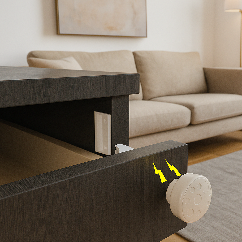 De SafeMag™ kindersloten worden volledig aan de binnenkant van kasten en lades bevestigd. Voor kinderen blijven ze onzichtbaar en ontoegankelijk, terwijl ouders met de magnetische sleutel in één beweging alles openen. Dit slimme ontwerp voorkomt dat kleine avonturiers bij gevaarlijke voorwerpen zoals schoonmaakmiddelen of scherpe spullen kunnen komen.